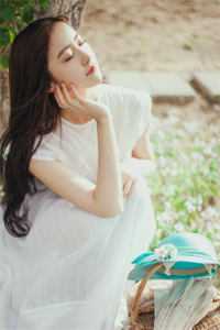 双腿交叠,裙摆滑落至大腿根。